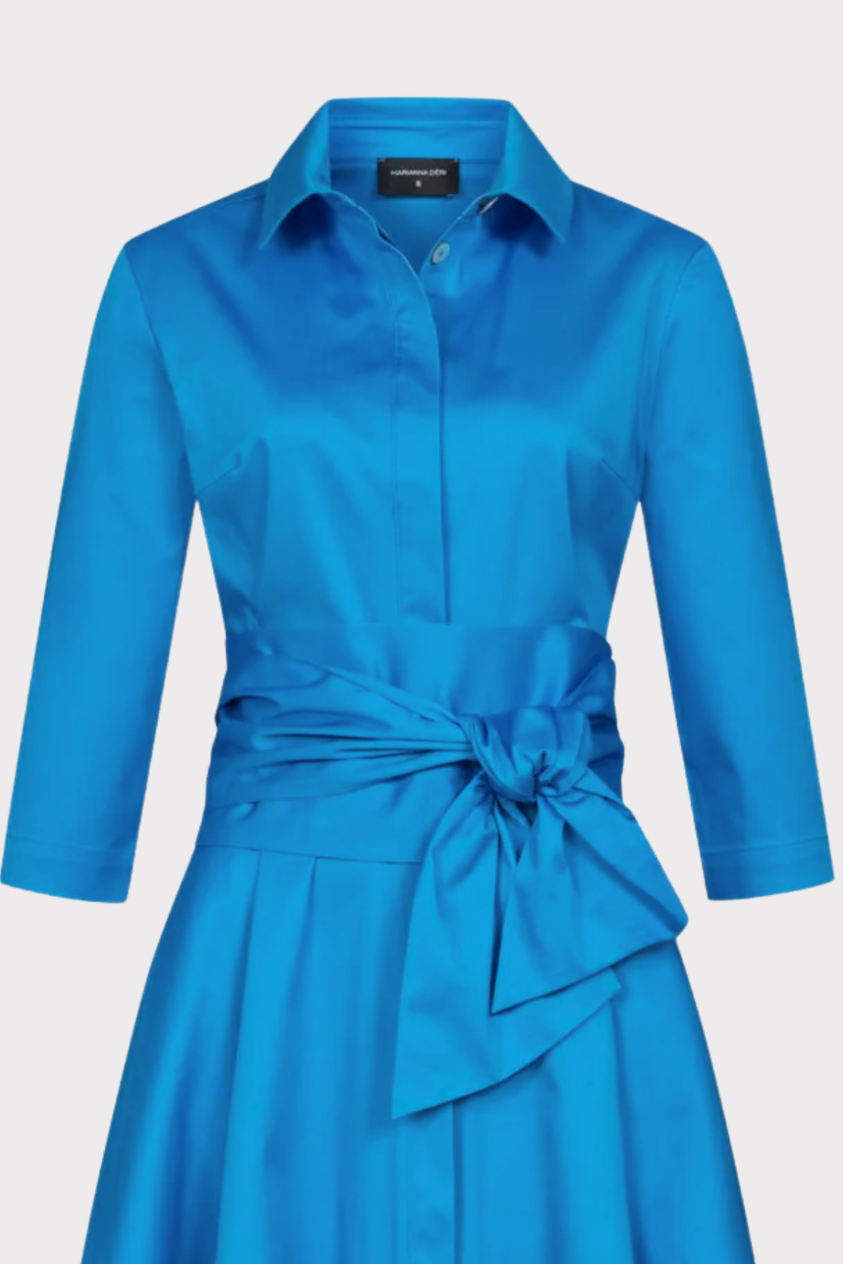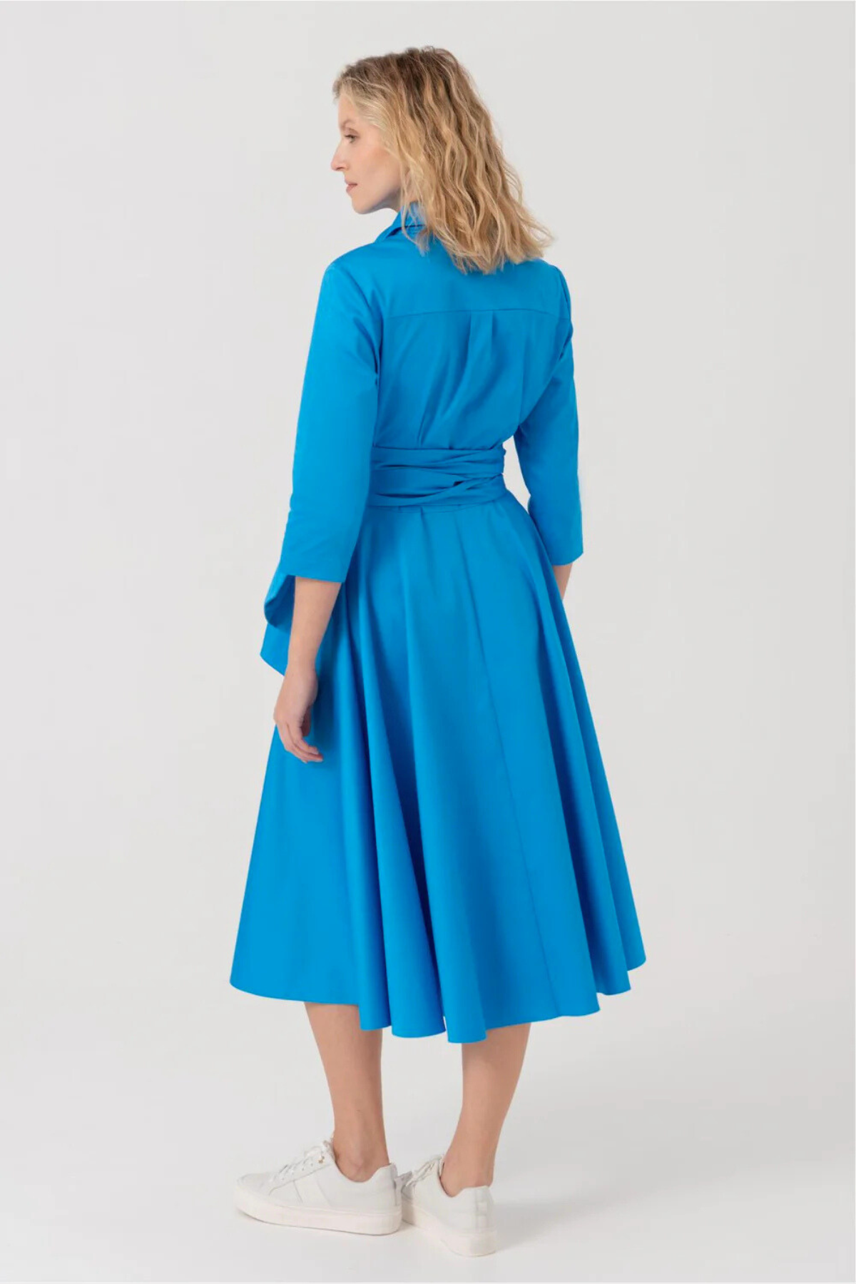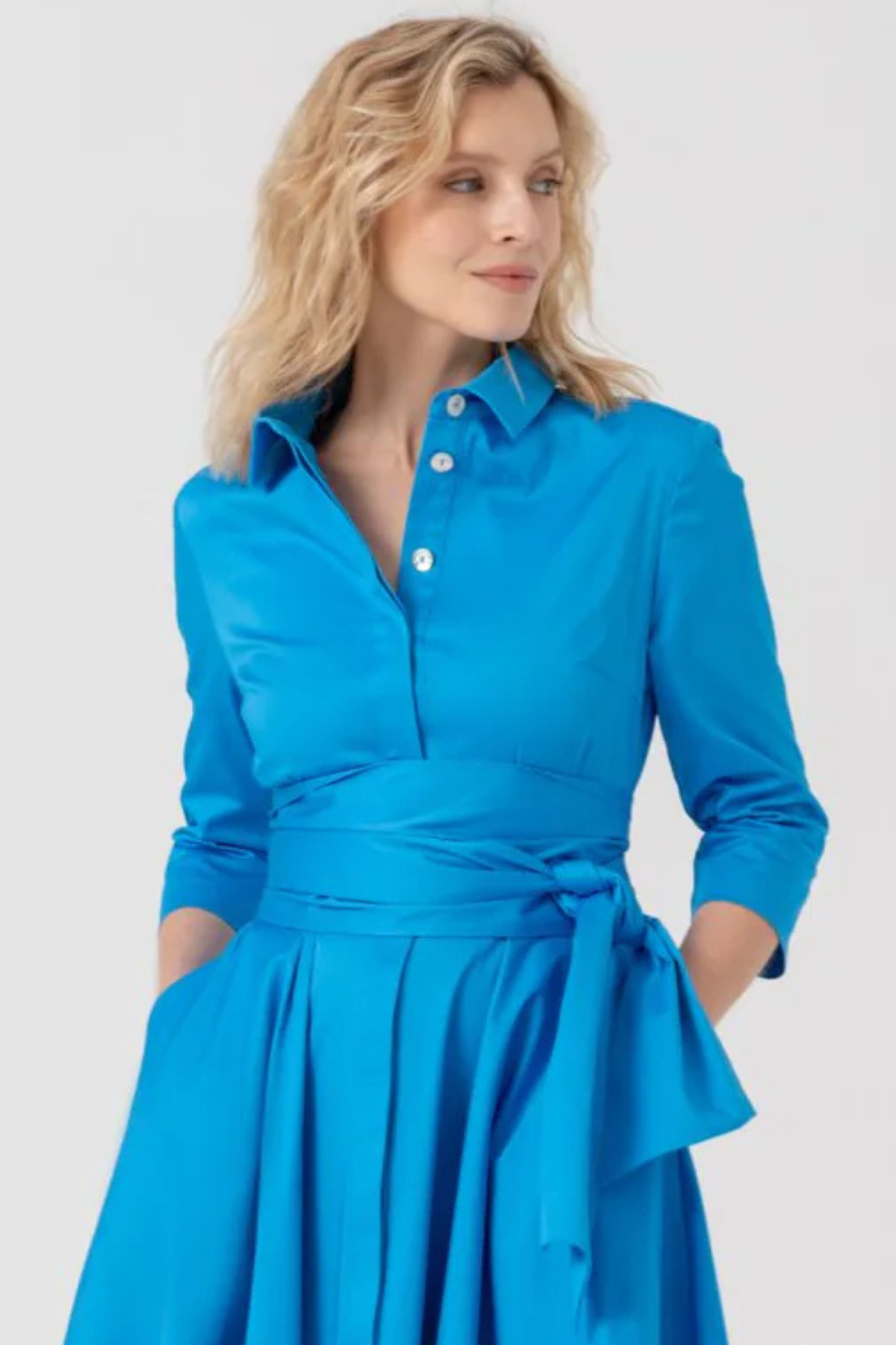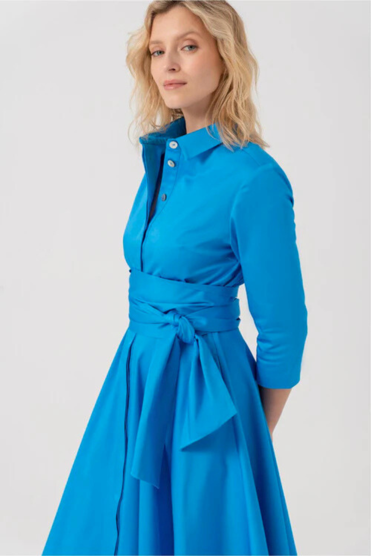 Timeless, versatile, and effortlessly chic, this beautiful Deri Sky Blue Classic Shirtdress, designed and made in Europe, moves elegantly with you from day to night. Featuring a softly swinging skirt and a flattering tie belt that defines the waist, it transitions seamlessly from office hours to afternoon strolls and evening plans. Style it with sneakers for a relaxed daytime look, or with stilettos or sandals for a sophisticated, elegant finish. Crafted from a comfortable 97% cotton blend with 3% elastane, this dress is a timeless piece you’ll reach for again and again.