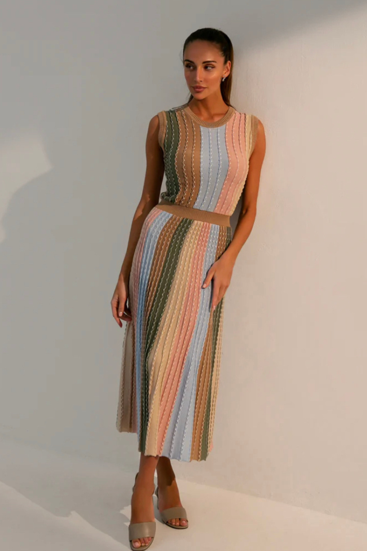 The Ella Knitted Midi Dress is a beautiful harmony of softness, color, and effortless elegance. This delicate, feminine dress offers a perfect harmony of softness, color, and effortless elegance. Crafted in Europe from a fine cotton-blend knit, it feels light and airy while offering just the right amount of stretch for comfort. Featuring a graceful flared silhouette that flatters every figure, this piece enhances natural beauty with understated sophistication. The unique textured pattern in soft pastel hues creates a chic and modern look that transitions seamlessly from day to evening. A timeless favorite designed to make you feel confident, graceful, and effortlessly stylish.