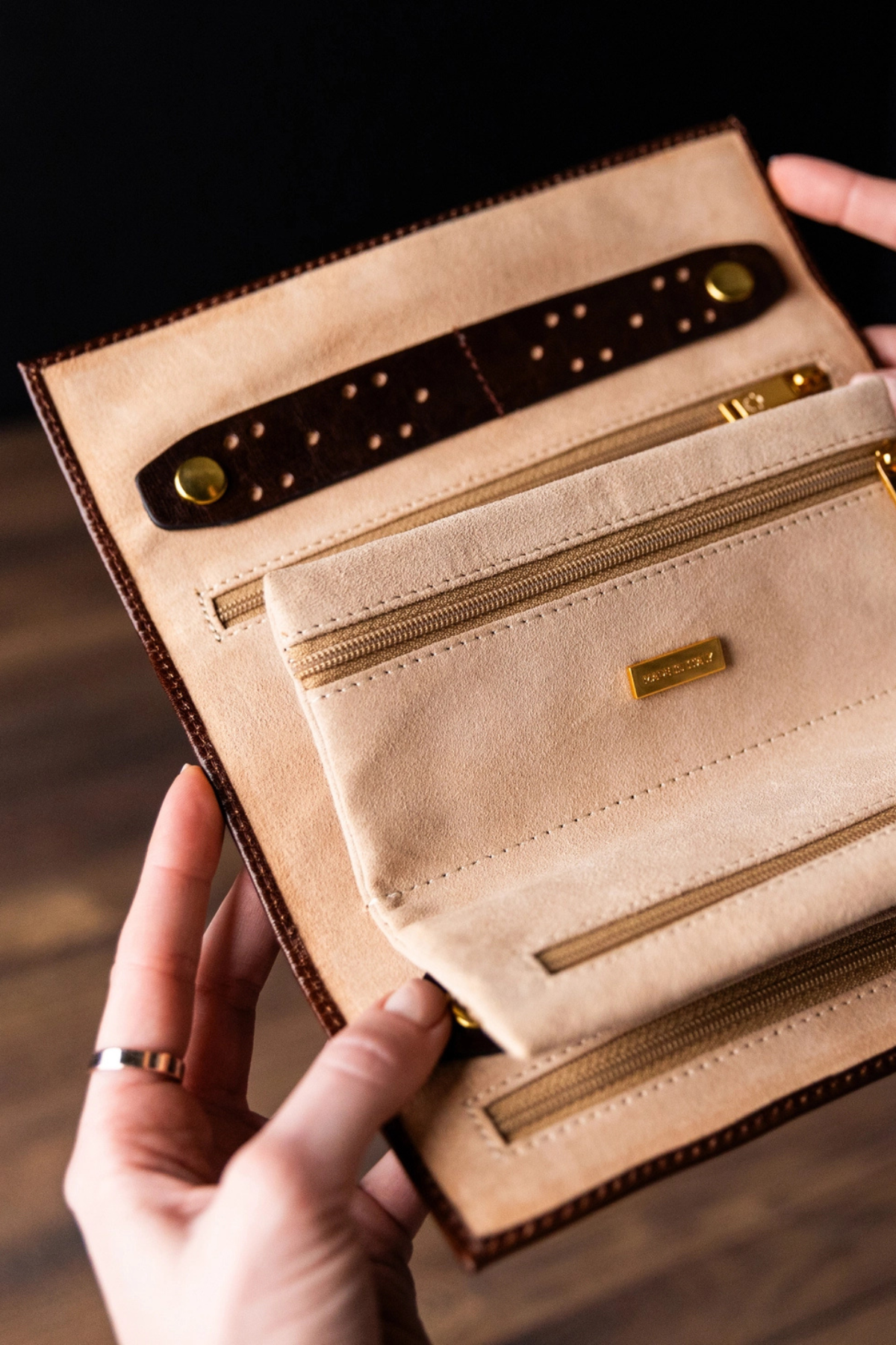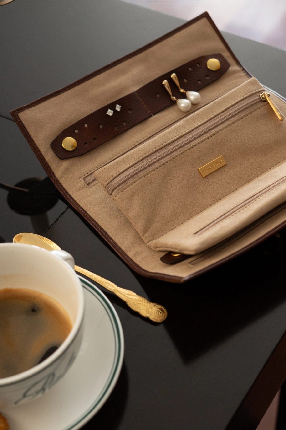 Elegant, practical, and timeless, the Madame Leather Roll Travel Case is a beautifully designed travel essential for the modern woman. Handcrafted in Italy from supple full-grain Vachetta leather and lined with soft goat leather, it unrolls to reveal a perfectly organized interior for your jewelry, cosmetics, or cherished accessories. Thoughtfully divided compartments and zip pockets keep your treasures pristine and protected wherever you go. Compact, lightweight, and luxuriously detailed, itโ€™s the ideal companion for travel, and aย perfect holiday gift for those who appreciate fine craftsmanship and understated elegance.