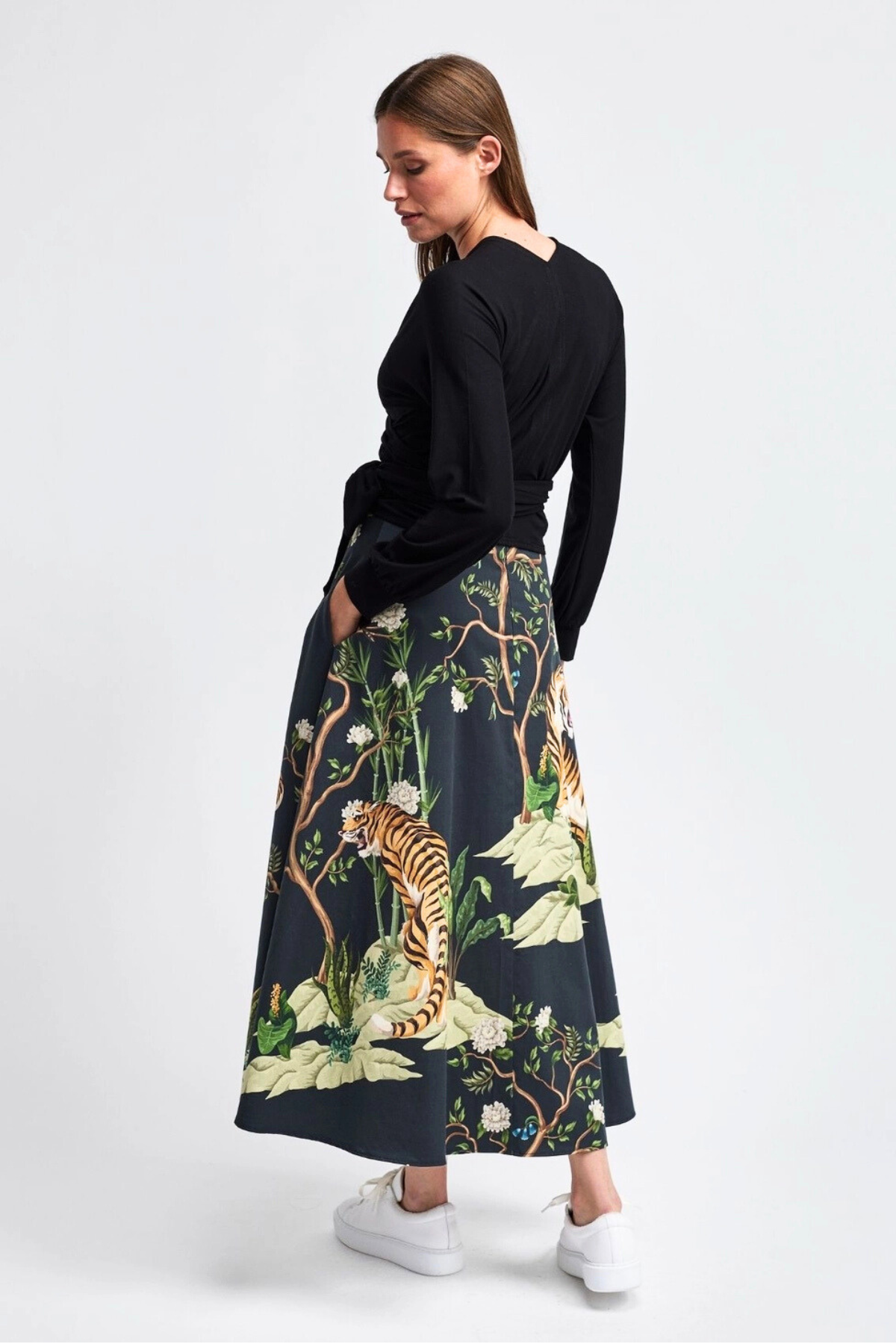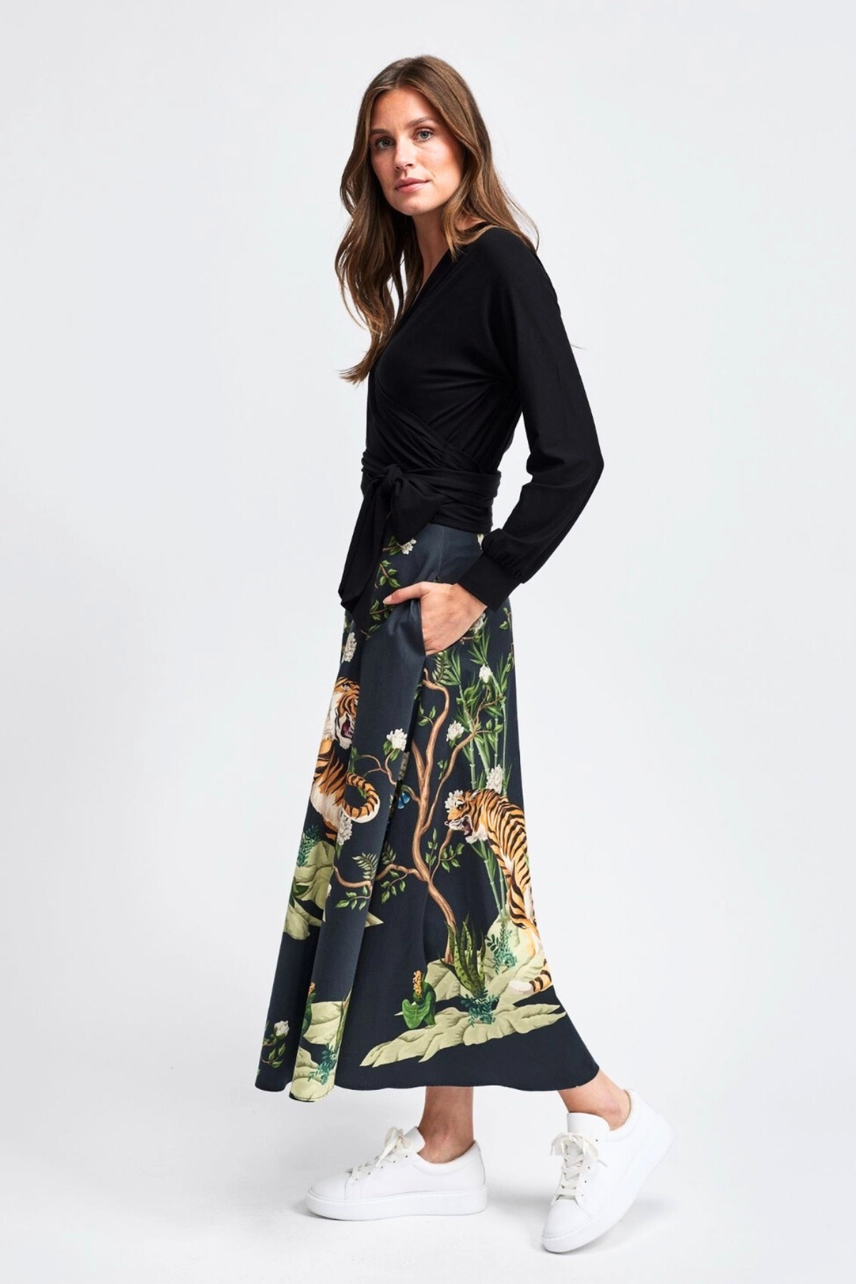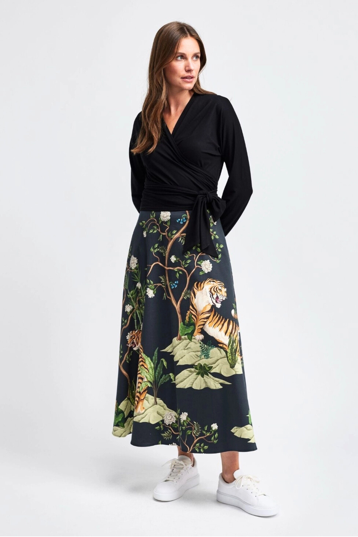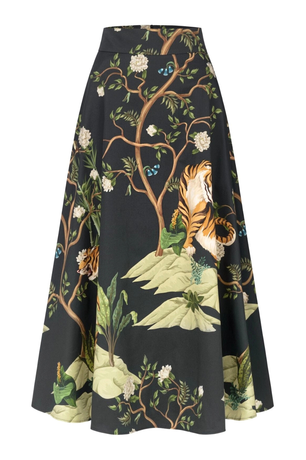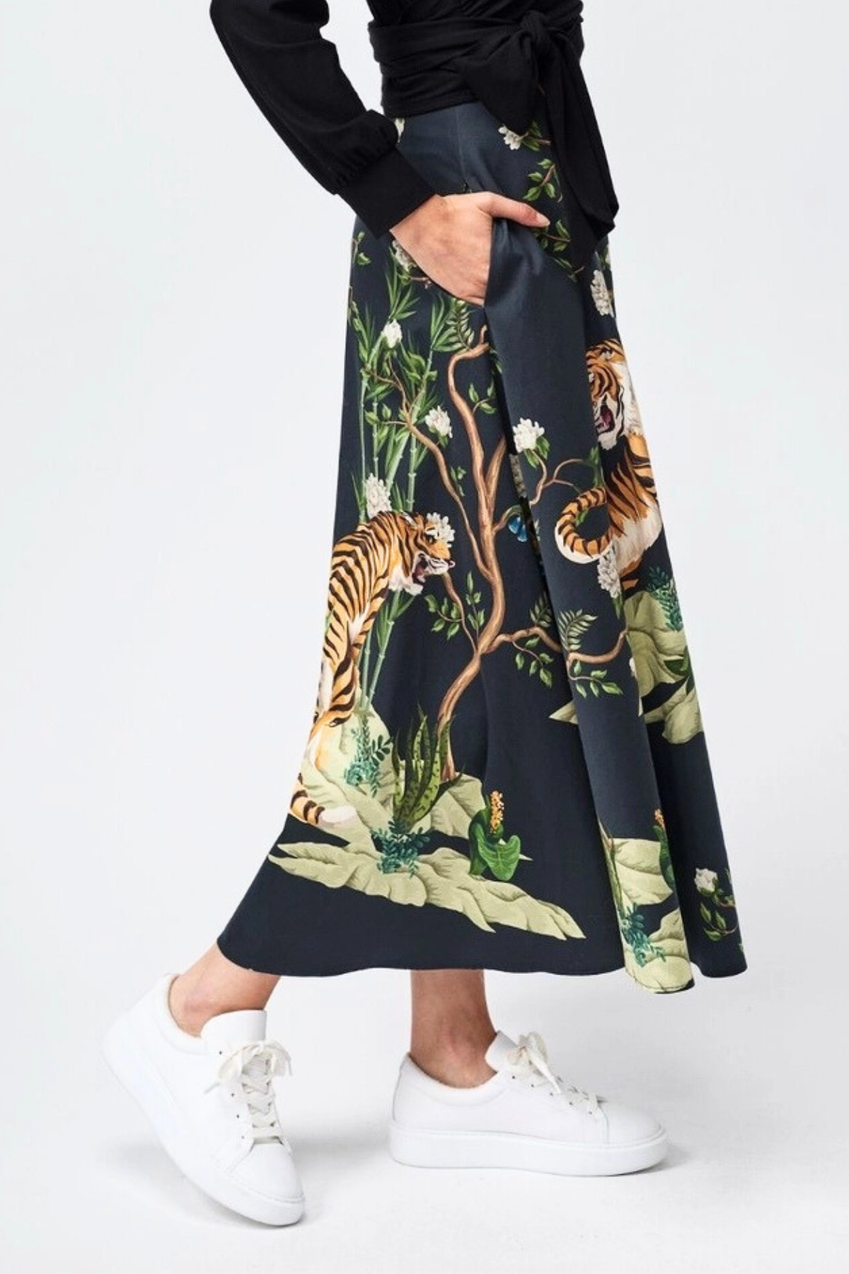 A skirt that tells a story of strength and grace. The Tiger Print Maxi Black Skirt features an exclusive artistic print of majestic tigers surrounded by lush botanicals, white blossoms, and hand-illustrated foliage. Its flowing A-line silhouette moves beautifully with every step, creating a feminine and confident presence. Thoughtfully crafted with side pockets, a soft lining, and a concealed zipper, this piece balances comfort with sophistication. Pair it with a sleek black wrap top or a fitted knit for an effortlessly chic look that speaks of modern elegance with a touch of wild charm.